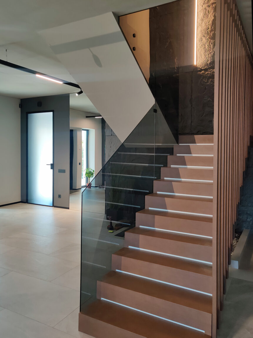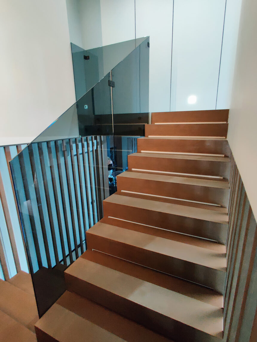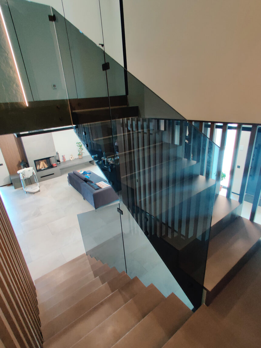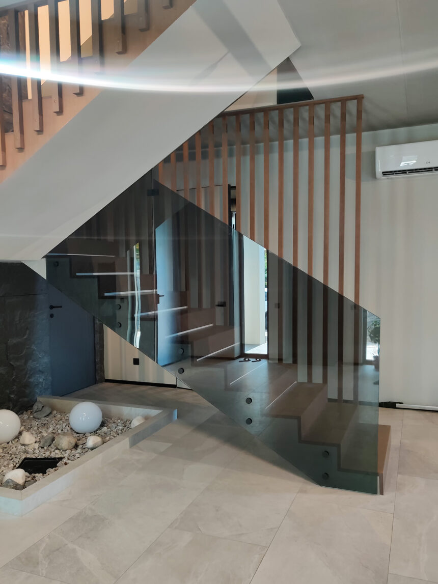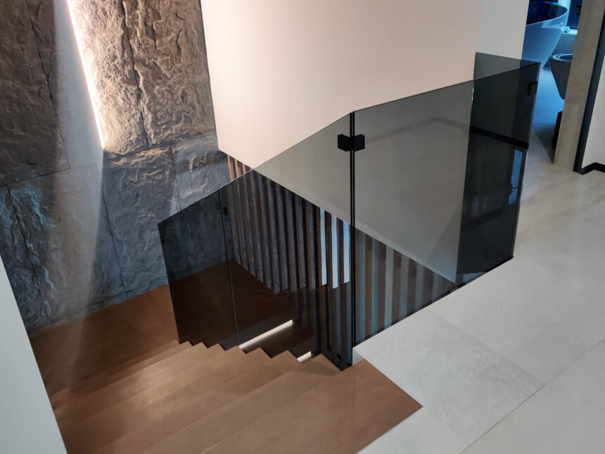 Современные интерьеры все чаще используют стеклянные ограждения лестниц как элемент, который объединяет безопасность и эстетику. В нашем проекте применено тонированное стекло толщиной 10 мм, что обеспечивает надежность конструкции и придает ей элегантный внешний вид. Использование закаленного стекла гарантирует прочность: материал выдерживает значительные нагрузки и устойчив к механическим повреждениям, сохраняя прозрачность и глубину цвета на протяжении многих лет.